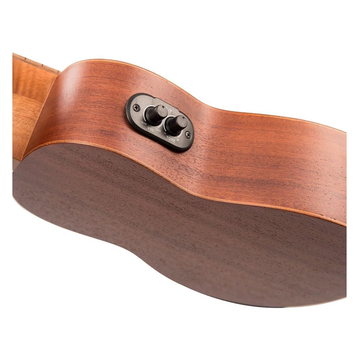 Top & Body are finished in clear satin finish to show the natural deep rich brown colour of the wood, the Laka Mahogany Series Electro-Acoustic Concert Ukulele is indeed, visually striking, offset with an Okoume neck, ABS nut, walnut fingerboard and bridge. Sapele is specifically chosen for its warm, woody sound, delivering a natural and balanced tonal response. Details include a palm tree rosette and headstock design, with Laka motif on the headstock.